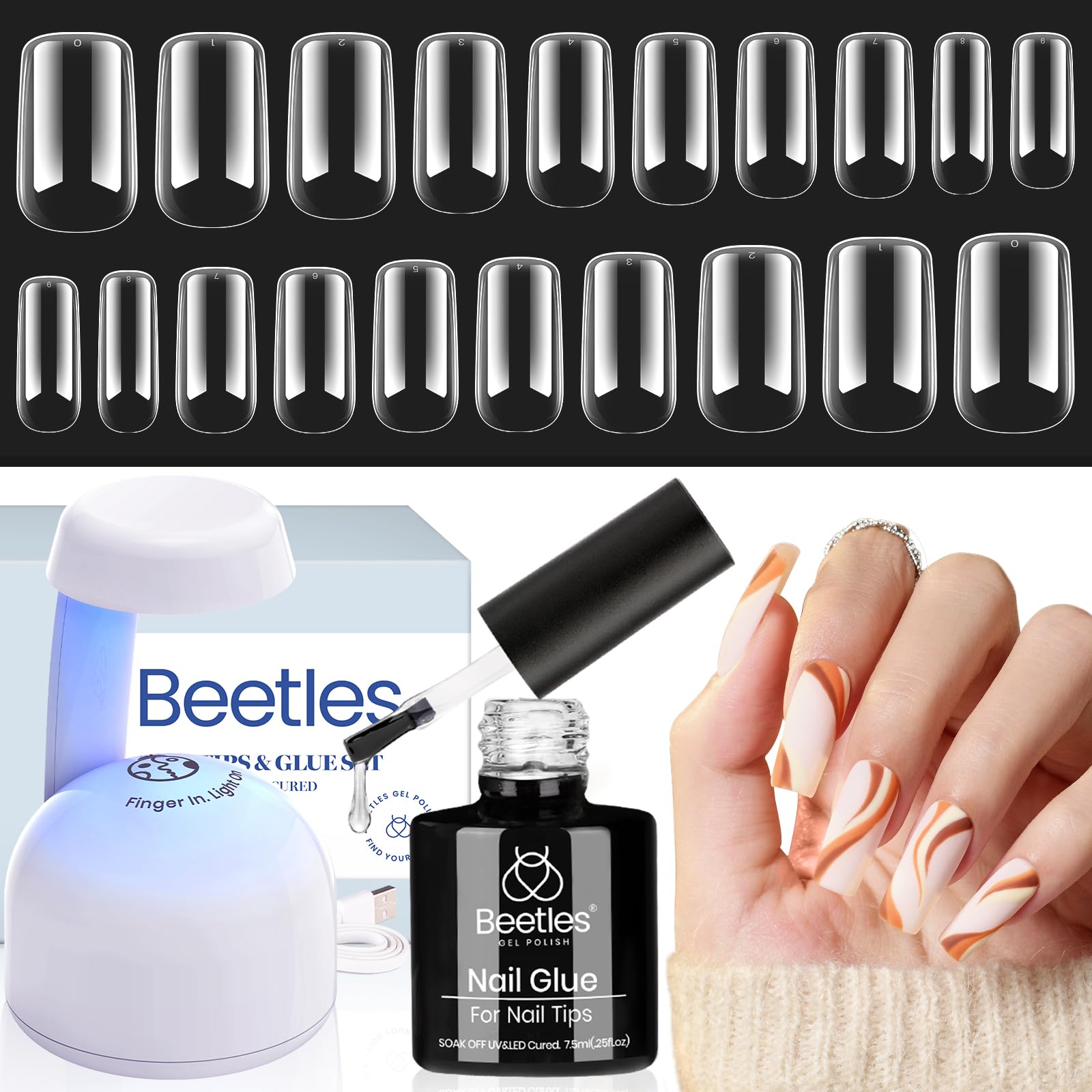 - Beetles Medium Nail Tips and Glue Gel Kit: Our new Nail Tips and Glue Gel Kit includes one Uv Led Nail Lamp, 7.5ml/0.25 fl.oz Nail Glue Gel, and 500pcs Square Nail Tips! You can easily extend your nails and enjoy the fun of Diy ! The Newest, The Fastest, Most Professional, Nail enhancement in 2024 New Nails.
