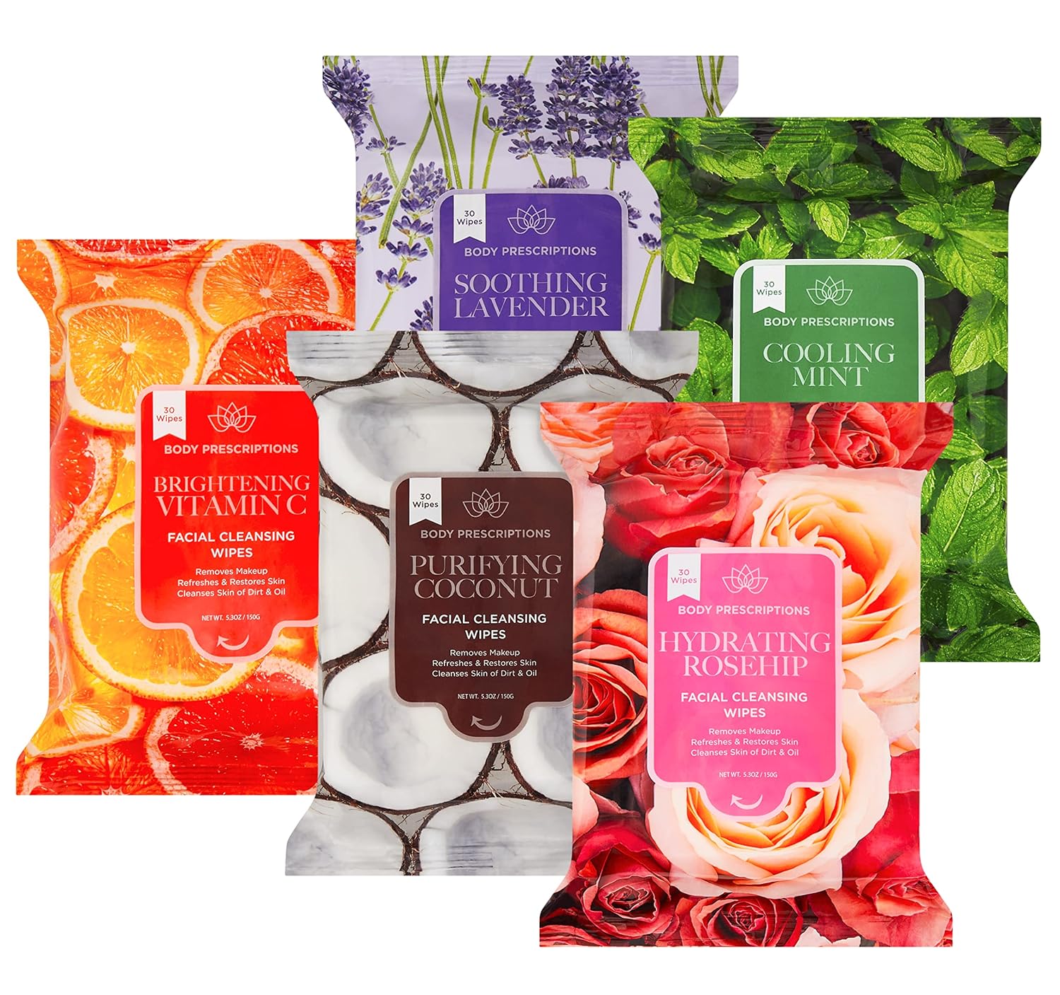 Body Prescriptions Makeup Remover Wipes Bulk, 5 Pack, 150 Facial Cleansing Cloths Removes Makeup, Mascara, Dirt and Oil (Mint, Rosehip, Vitamin C, Lavender and Coconut)