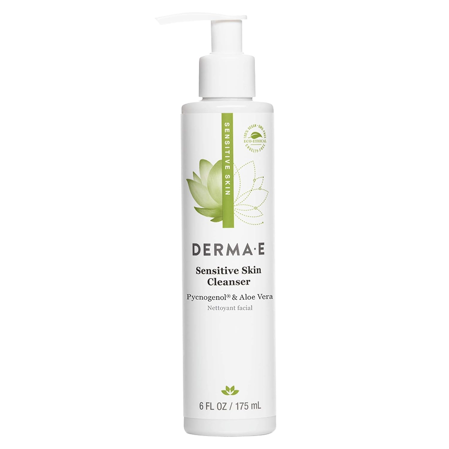 This gentle pH balanced facial cleanser is an ideal daily face wash for those with sensitive skin or rosacea. The liquid face cleanser gently lifts away dirt, makeup and impurities while soothing skin, reducing redness and irritation. The fragrance-free facial wash is formulated with skin calming Aloe Vera, and anti-aging antioxidants Pycnogenol and Green Tea to protect skin while you cleanse.Leaving skin clean and satiny-smooth, the unscented face wash for sensitive skin is finished with botanical extracts to leave the skin looking and feeling clean, healthy, hydrated and refreshed.DERMA E's Sensitive Skin Cleanser can be used daily, morning and evening. For best results, splash your face with water and lather the facial cleanser in moistened hands. Massage the gentle face wash over your entire face and neck, and then rinse thoroughly with water. Pat skin dry.KEY BENEFITS- Gentle face wash lifts dirt, bacteria and impurities from skin.- The unscented, pH balanced cleanser is ideal for sensitive skin.- Formulated to calm, soothe and reduce redness and irritation.CLEAN, ALL NATURAL INGREDIENTSPacked full of skin-loving nutrients, antioxidant-rich Pycnogenol reduces the appearance of lines, wrinkles and aging skin; Green Tea helps reduce redness and inflammation to defend skin from environmental stressors; Chamomile Flower Extract works to calm and soothe sensitive skin and helps increase skin's natural glow; Lemongrass works as a toner and firms the skin as it helps remove impurities.DERMA E Sensitive Skin Cleanser is 100% vegan and cruelty-free, and does not contain parabens, sulfates, mineral oil, lanolin, gluten or GMOs.