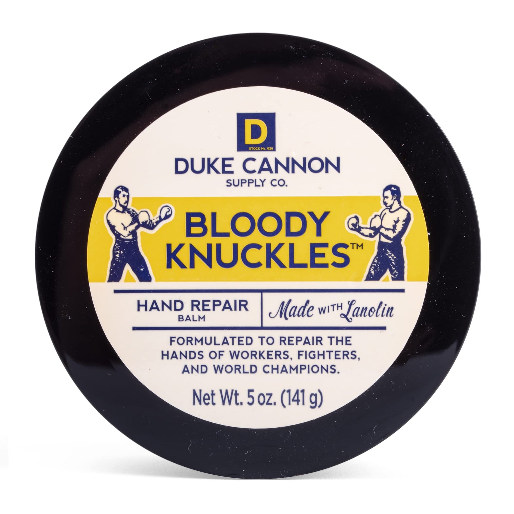 Details: Duke Cannon Bloody Knuckles Hand Repair Balm 5 oz. - Dry, cracked hands are like living testaments to a man's hard work and ingenuity. And while hard working hands are to be celebrated, let's be honest: dry, chapped hands feel awful. That's why Duke Cannon introduced Bloody Knuckles Hand Repair Balm, made with lanolin. It provides much-needed moisture without leaving the hands feeling sticky or greasy (like that stuff in the green jar). At 5 oz, this is a hearty serving that will last a good long time. Formulated to repair the hands of workers, fighters, and world champions. Using the finest ingredients to defend your assets against the elements. Unscented, Fragrance-Free, Paraben-Free, Aluminum-Free, Dye-Free, Phthalate-Free // Duke Cannon is America's most American brand, designed to meet the high standards of hard working men who want to get clean & smell good without using feminine shower gels and accessories. // A portion of the proceeds benefits U.S. Veterans. Cruelty-Free - Never tested on Animals. Made in the USA