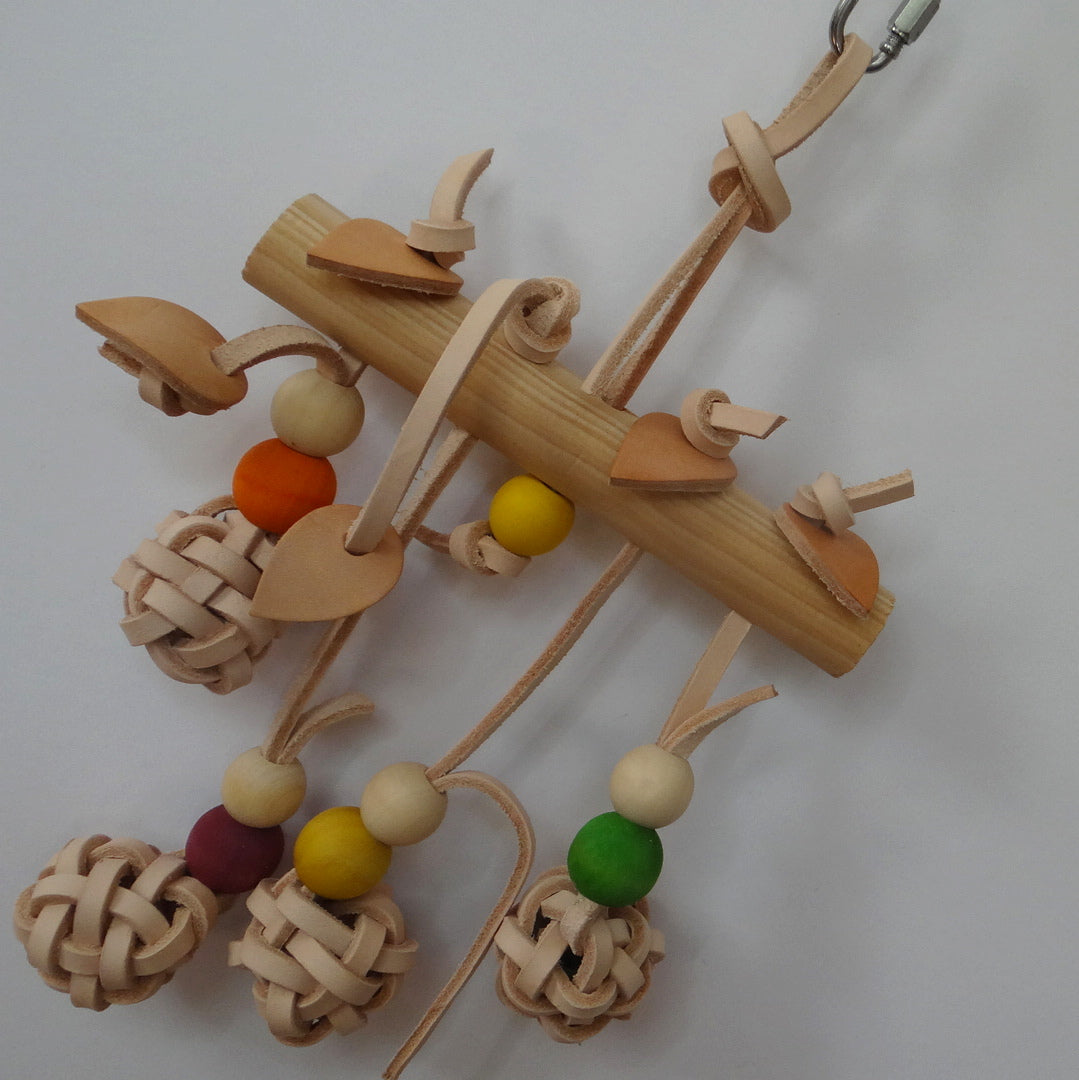 4 delightful berries are hanging from pine wood with vegetable tanned leather leaves.